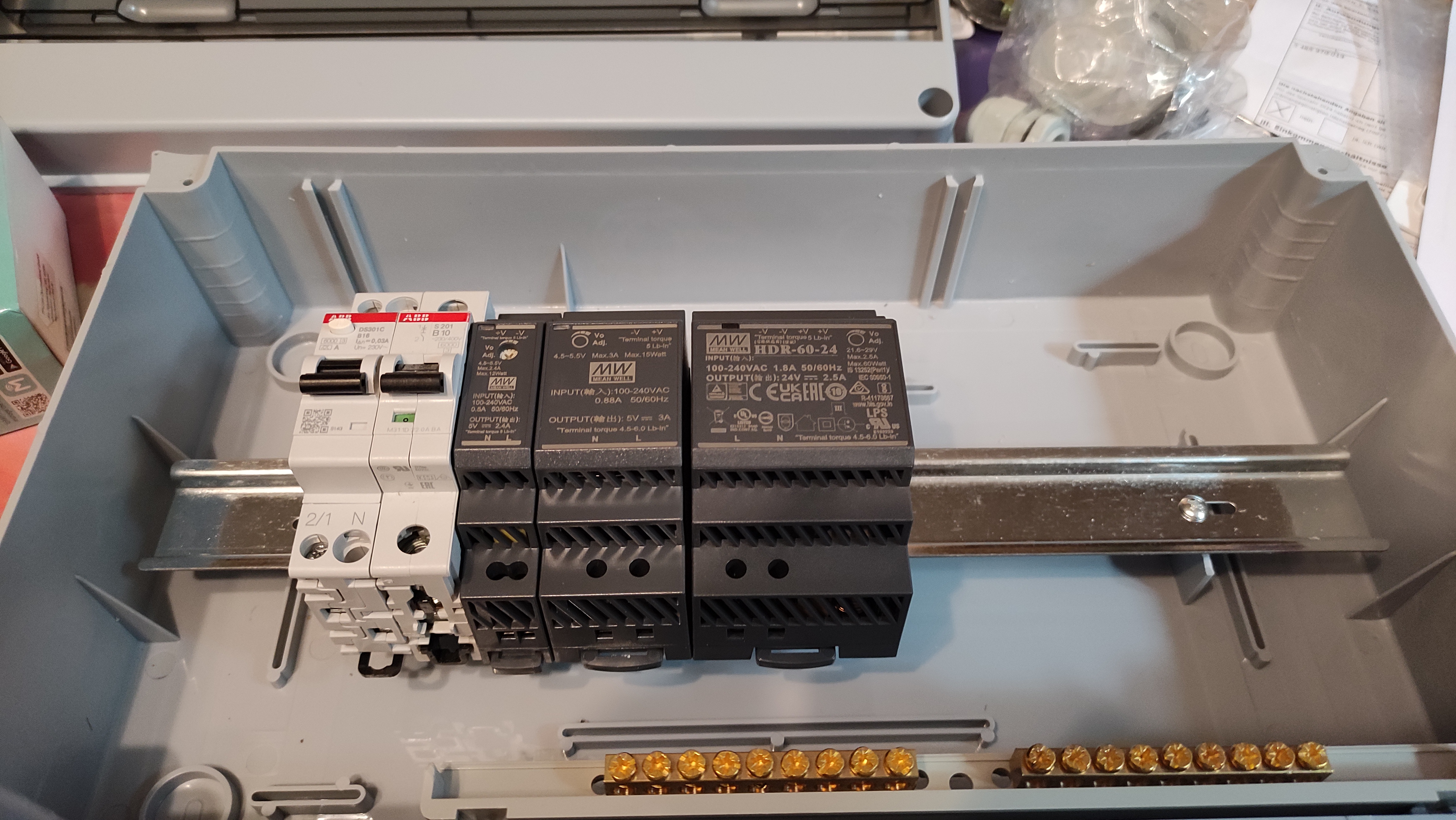 Jetzt muss die Außeneinheit geplant und aufgebaut werden. Als Außeneinheit dient ein wetterfestes AP Unterverteilungsgehäuse. Neben einem FI-Schalter und einem 10A Sicherungsautomaten folgen 3 Netzteile. Ein Netzteil für den Einplatinencomputer, ein weiteres für das Relaisboard und dann das letzte Netzteil für die Stellmotoren von Hunter in der Unterflurverteilung für die einzelnen geplanten Wasserkreise im Garten.