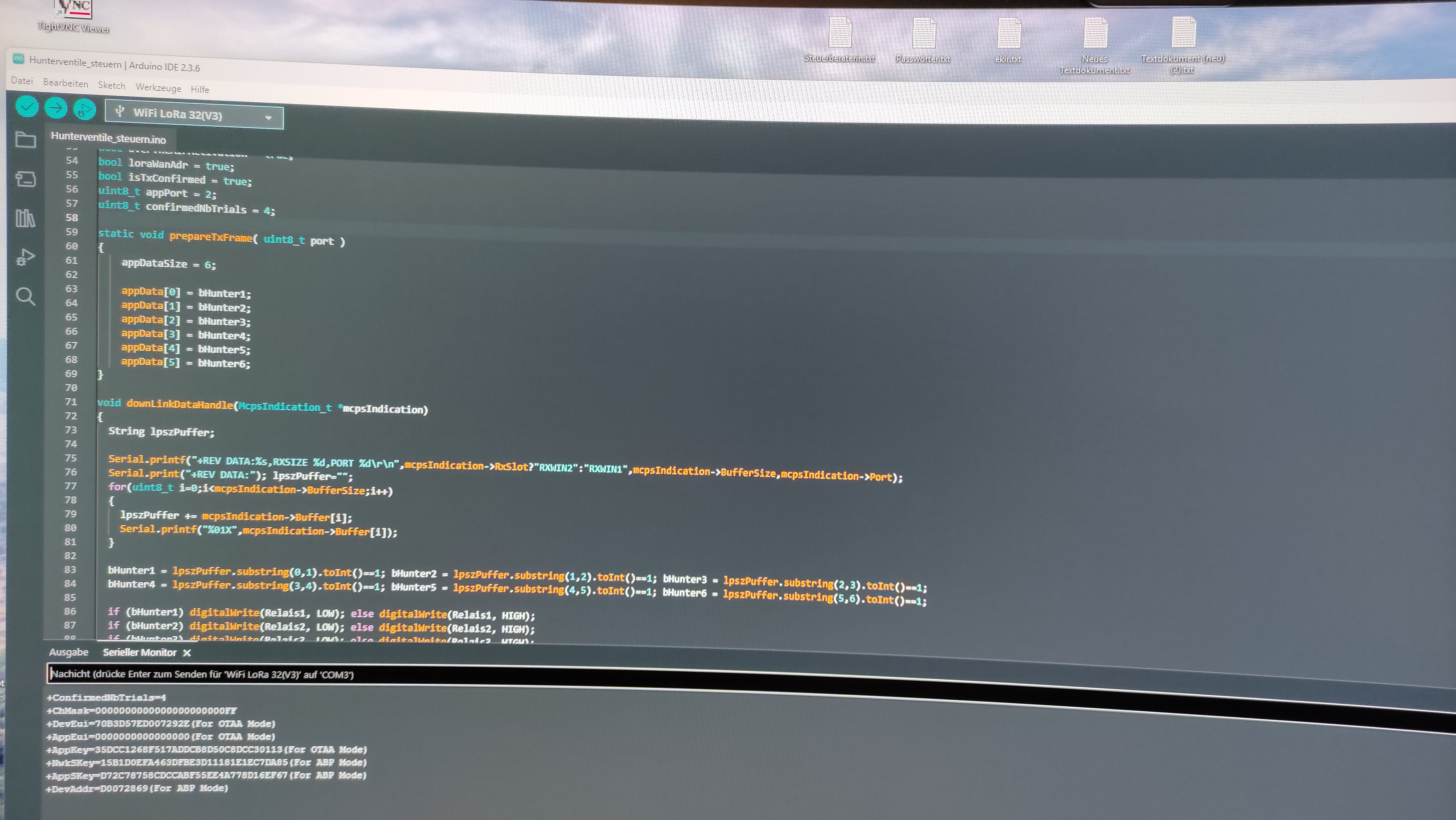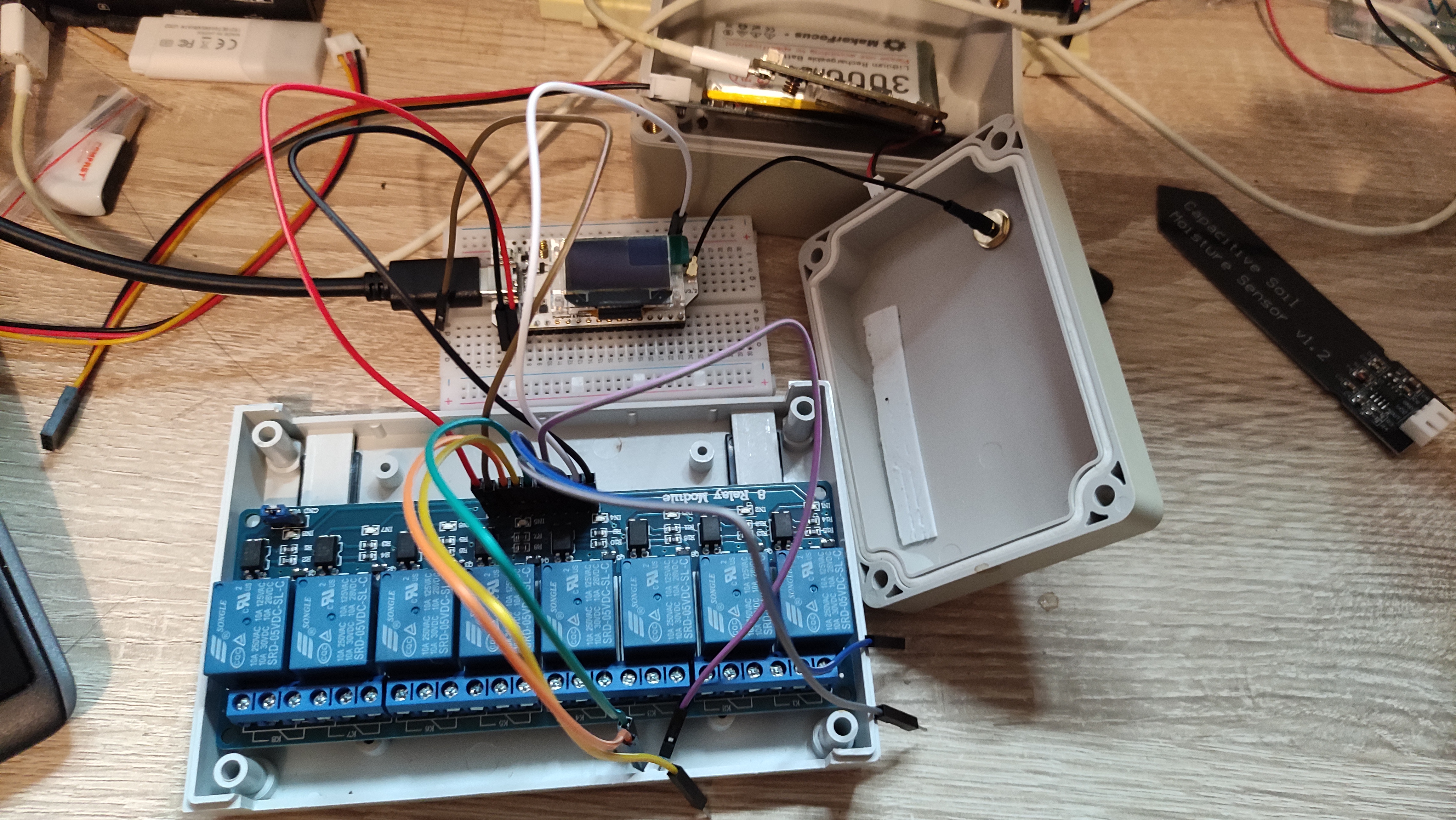 Zu Beginn mussten Erfahrungen mit Lötarbeiten, Breadboards und diversen elektronischen Bauteilen gesammelt werden. Hier im Beispiel ist ein LoRa 32 V3 Einplatinencomputer mit einem 8-fach Relaisboard verbunden.